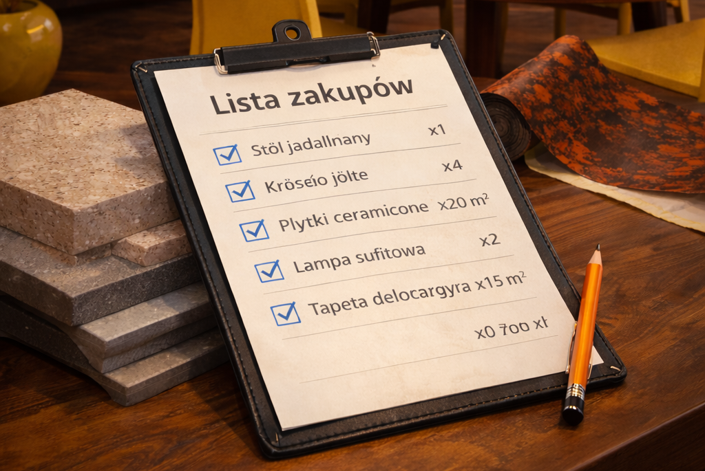Przygotowujemy listę zakupów, która ułatwia realizację projektu. Zawiera ona konkretne produkty, materiały i elementy wyposażenia wraz z ilościami oraz wskazówkami zakupowymi. Dzięki temu oszczędzasz czas, unikasz przypadkowych decyzji i masz pewność, że wszystkie elementy będą do siebie spójnie pasować.
